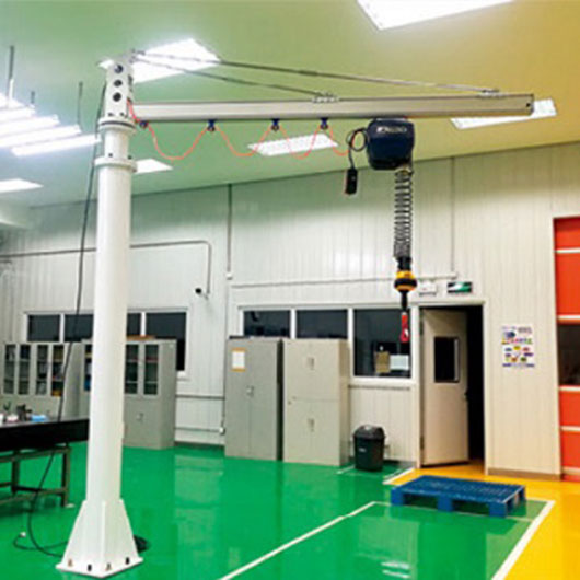 悬臂起重机由立柱和悬臂组成。立柱固定在地面上,以立柱为中间点,臂长为半径,可旋转。安装在悬臂起重机上的电动平衡起重机可在旋转范围内重复运输。