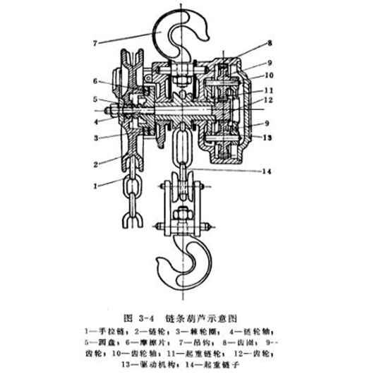 图为齿轮式链条葫芦。提升重物时,手拉链1顺时针旋转链轮2。链轮2沿圆盘5套筒上的螺纹向内移动,将棘轮圈3和摩擦片6压在链轮轴4上(链轮轴4与圆盘5结合牢固),棘轮圈3只能顺时针旋转,棘爪在棘轮圈3上跳动发出咔嗒声。链轮轴4右端的齿轮12驱动齿轮9(或行星齿轮)与固定齿圈8啮合,使齿轮9沿链轮轴4的中点顺时针移动。同时,驱动机构13和起重链轮11旋转,使起重链14上升。