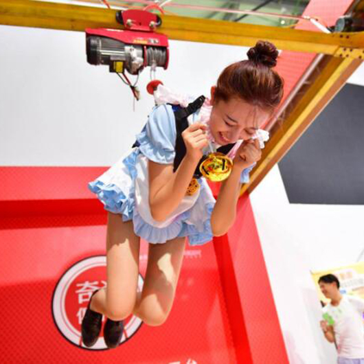 据了解,很多地方的商场都有真人抓娃娃机。除了大一点的真人抓娃娃机,其他的都和小真人娃娃机一样。将安全绳绑在孩子身上,拉起后慢慢移动到玩具池。安全绳着陆了。孩子们张开双臂,捡起一大包娃娃玩具,紧紧地抱着。安全绳升起,把兴奋的孩子拉到玩具池外降落。孩子们很高兴抓到这么多玩具。